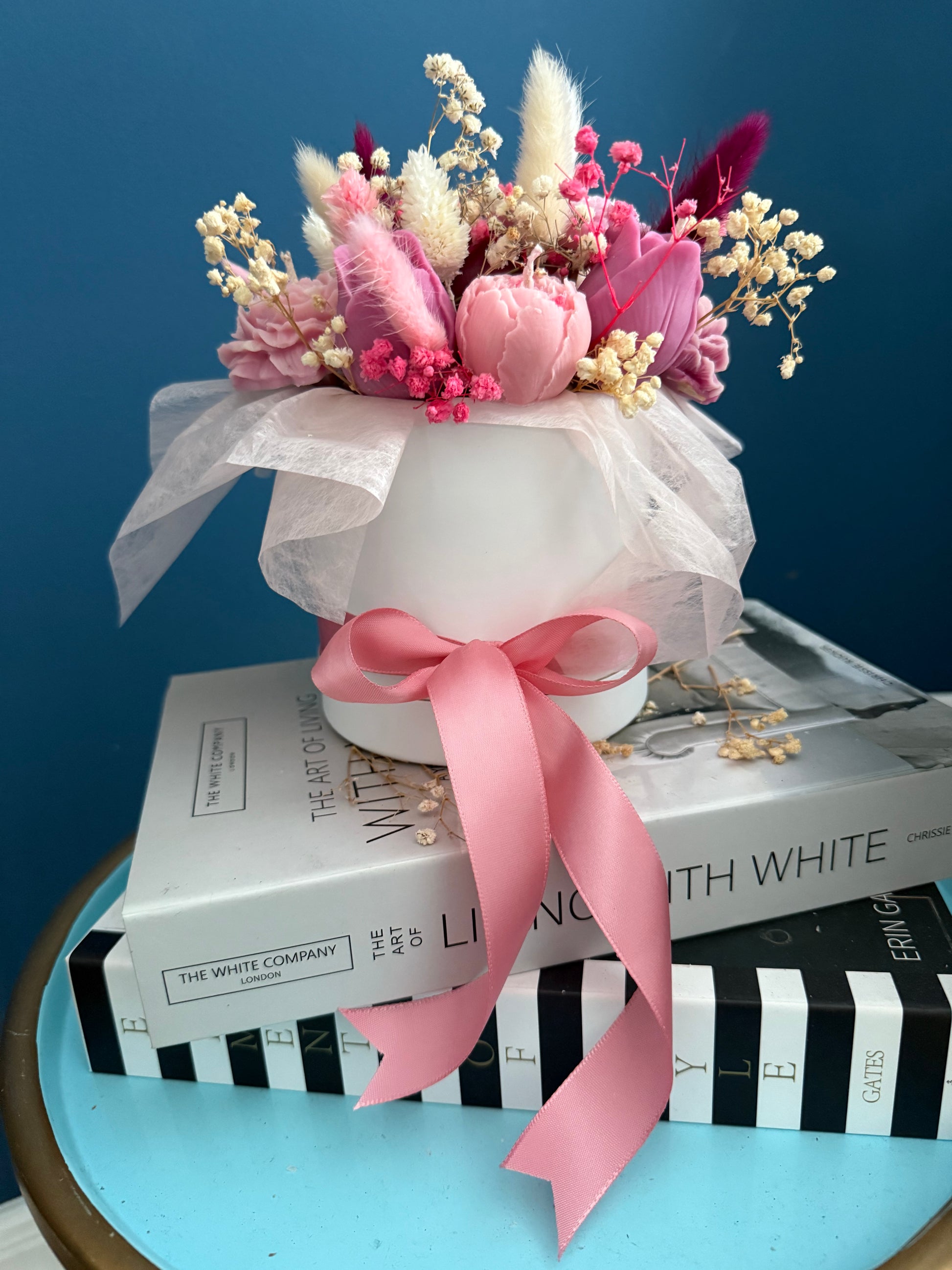 Duftkerzen-Blumenbox inkl. Trockenblumen und Schleife | Rosige Duftkerzen personalisierbar